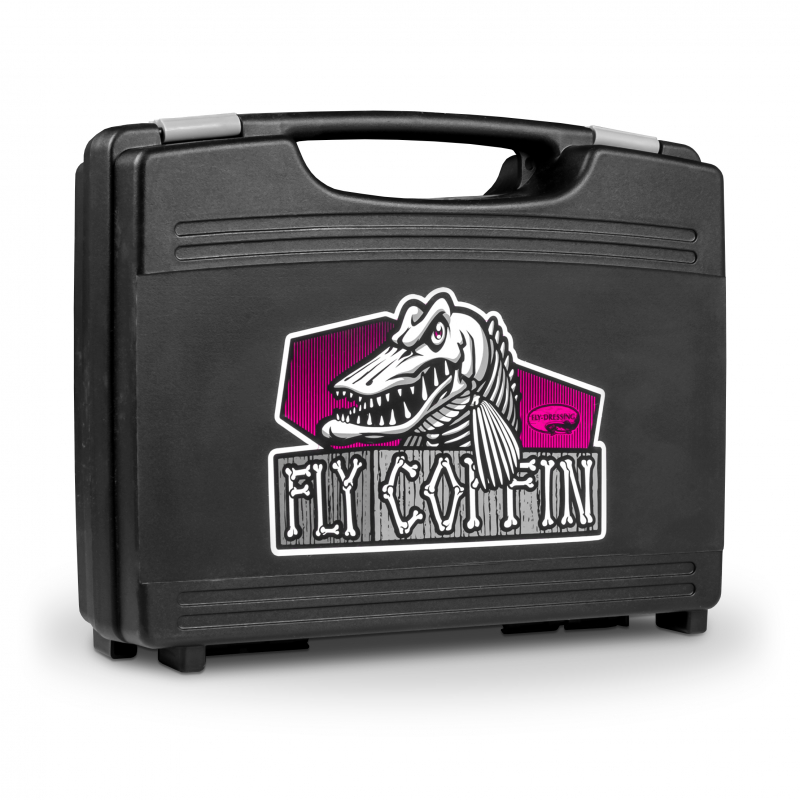 La boîte est en plastique et possède des poignées, des fermetures à pression et une charnière. L’intérieur est en mousse, mais contrairement aux autres boîtes en mousse lisse, Fly Coffin a une mousse fendue, où la pointe du crochet descend une piste et maintient ainsi la mouche en place. Équipé de mousse dans le couvercle et le fond.