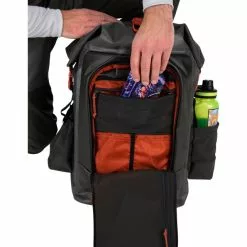 Fermeture à enroulement de grande capacité pour une protection imperméable avec manchon en filet intégré derrière la poche avant Grande poche extérieure zippée avec organisation interne supplémentaire comprenant deux poches zippées, un porte-clés et deux poches pour accessoires Deux poches renforcées pour bouteilles d’eau avec fermetures à cordon ; double comme étuis de tube de tige Sangles de sangle réglables et amovibles pour la compression latérale et la fixation d’accessoires Points d’attache Hypalon et guirlande externe pour ajouter d’autres équipements et accessoires au sacPanneau arrière hydrophobe moulé par compression et bretelles rembourrées respirantes avec port de fixation pour outils.Capacité : 50LDimensions : 61 x 33 x 23cm // (24″H x 13″L x 9″P)